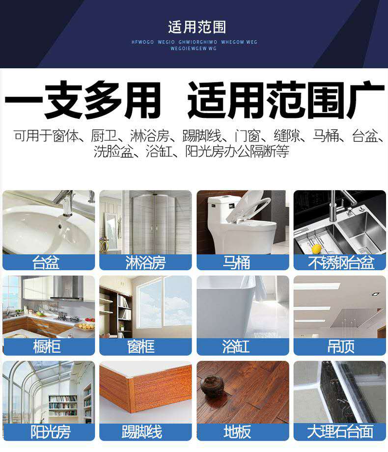 使用范圍:適用于中、小型明框幕墻、陽(yáng)光房、遮雨棚、不銹鋼、外墻工程、高端門窗安裝、玻璃、石材、鋁塑板、鋁合金、金屬、陶瓷等材料的粘結(jié)密封。